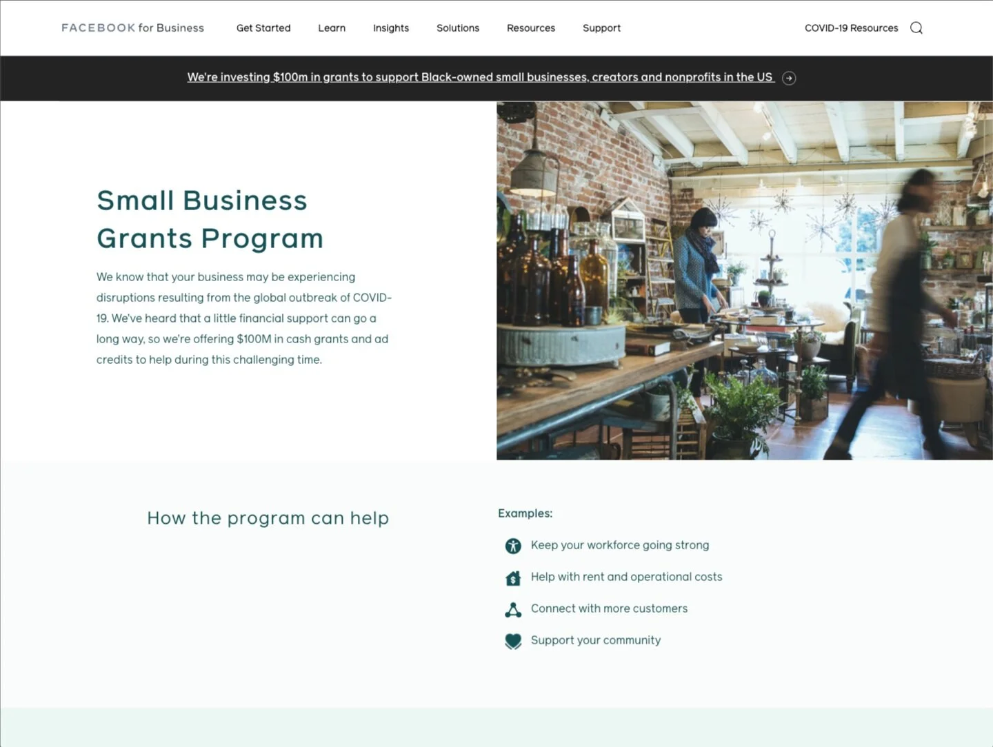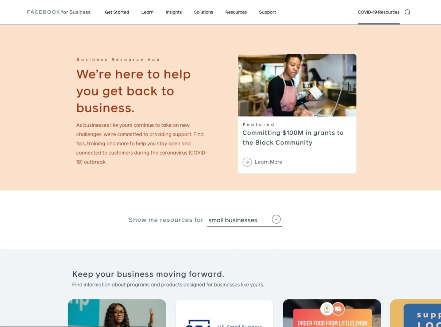 During this time, I shifted focus to support the development of the Small Business Grants Program, offering $100 million dollars in cash grants and ad credits to businesses around the world. The design and development of the Business Resource Hub, a collection of tips, training and partners to help businesses stay open and connected during the pandemic. As well as the Guide to Selling Online, a personalized web destination to help offline businesses create an online presence to start and continue making sales online.